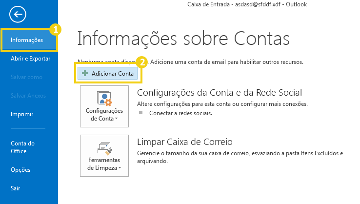 No programa do Outlook, vá no menu Superior e clique em Arquivo e em seguida, na aba Informações, clique em Adicionar Conta