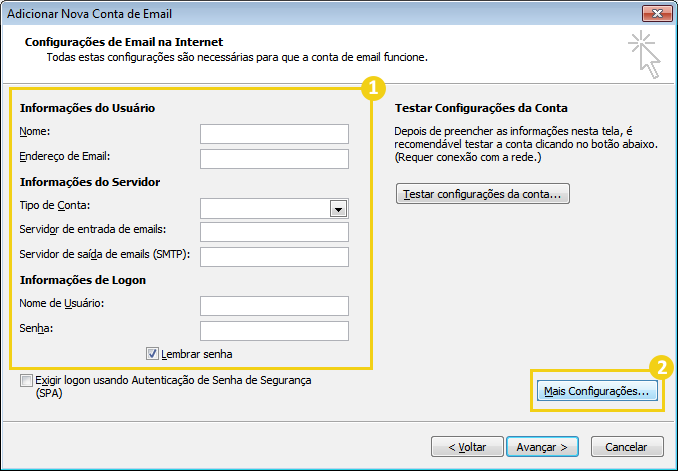 Preencha os campos conforme indicado abaixo e depois clique em Mais configurações: