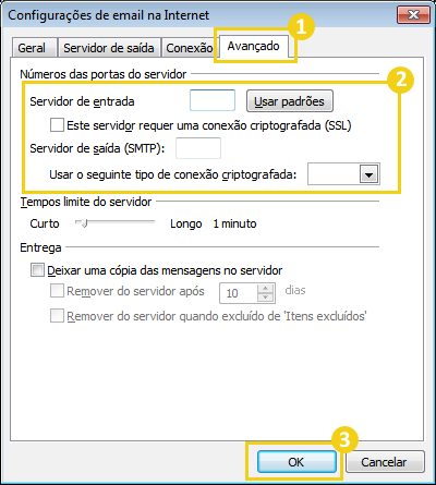 - Com conexão SSL: em POP3 insira o valor 995 e em SMTP insira 465- selecione a opção Este servidor requer uma conexão criptografa (SSL) e escolha a opção SSL